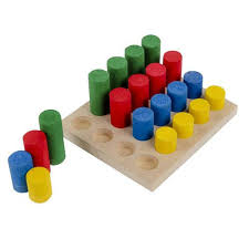 10. Encaixe de pinos – trabalha a concentração, a atenção, discriminação do tamanho, ordenação de tamanho, percepção da escala crescente e decrescente e contagem.