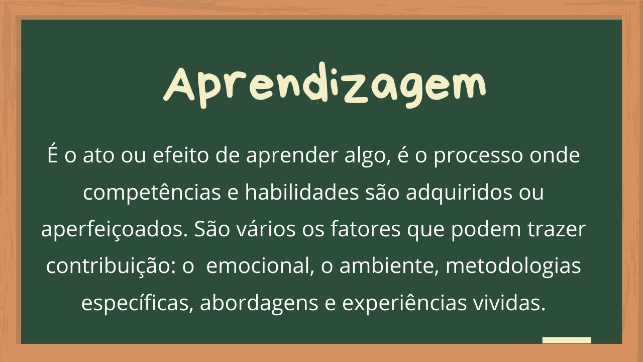 É o ato ou efeito de aprender algo, é o processo onde competências e habilidades são adquiridos ou aperfeiçoados. São vários os fatores que podem trazer contribuição: o emocional, o ambiente, metodologias específicas, abordagens e experiências vividas.